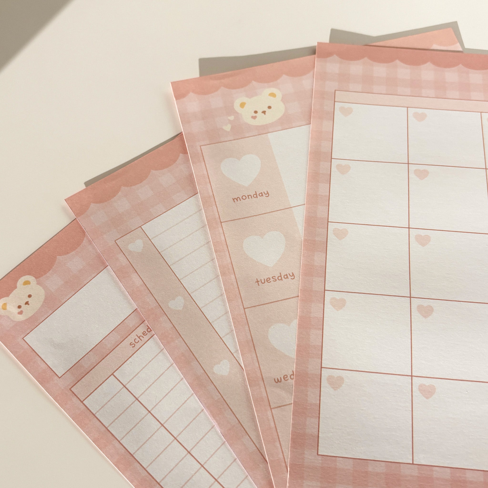- 4 designs: double sided daily planner (30 sheets), double sided weekly planner (30 sheets), monthly planner front / blank noted page (10 sheets), monthly planner back / lined notes page (10 sheets)