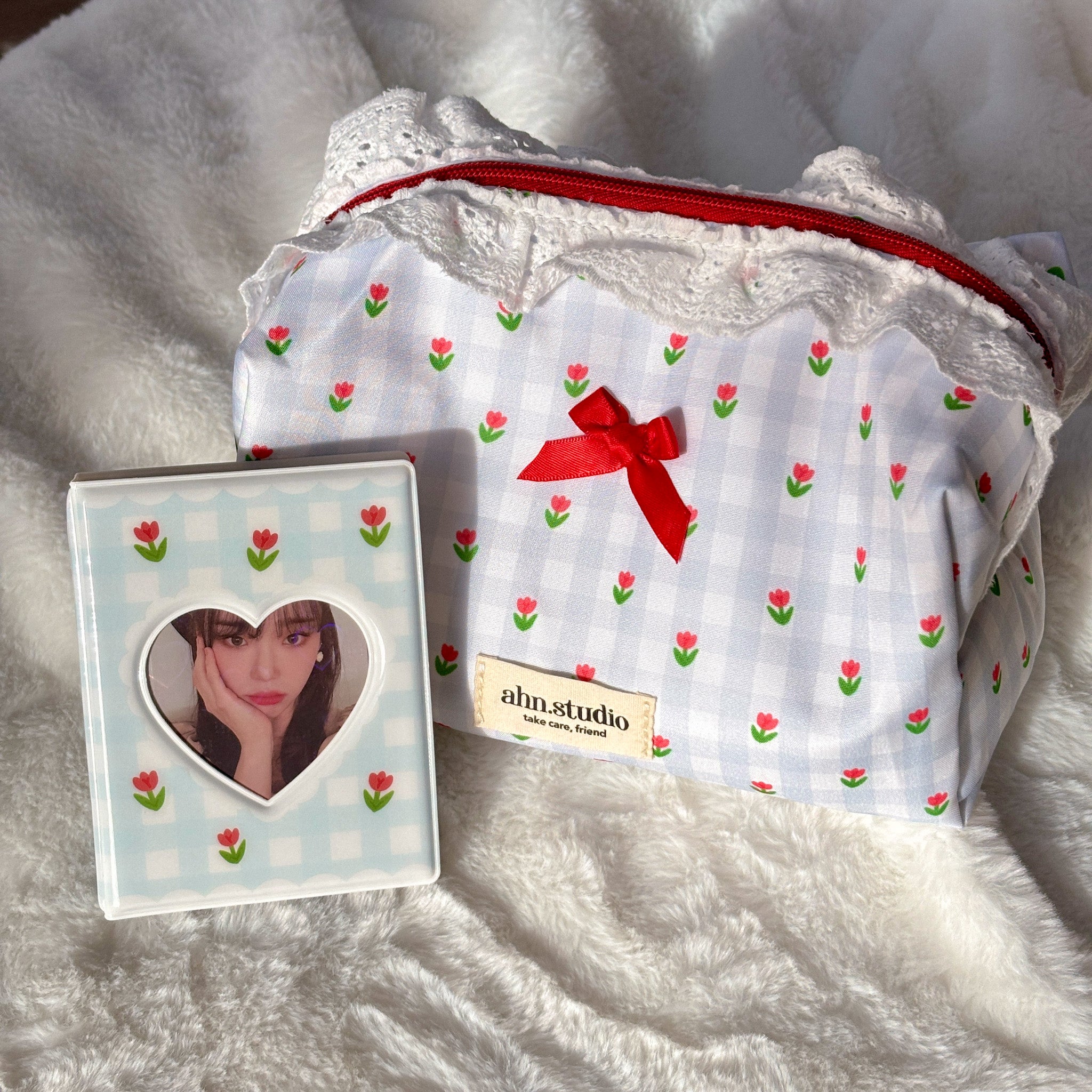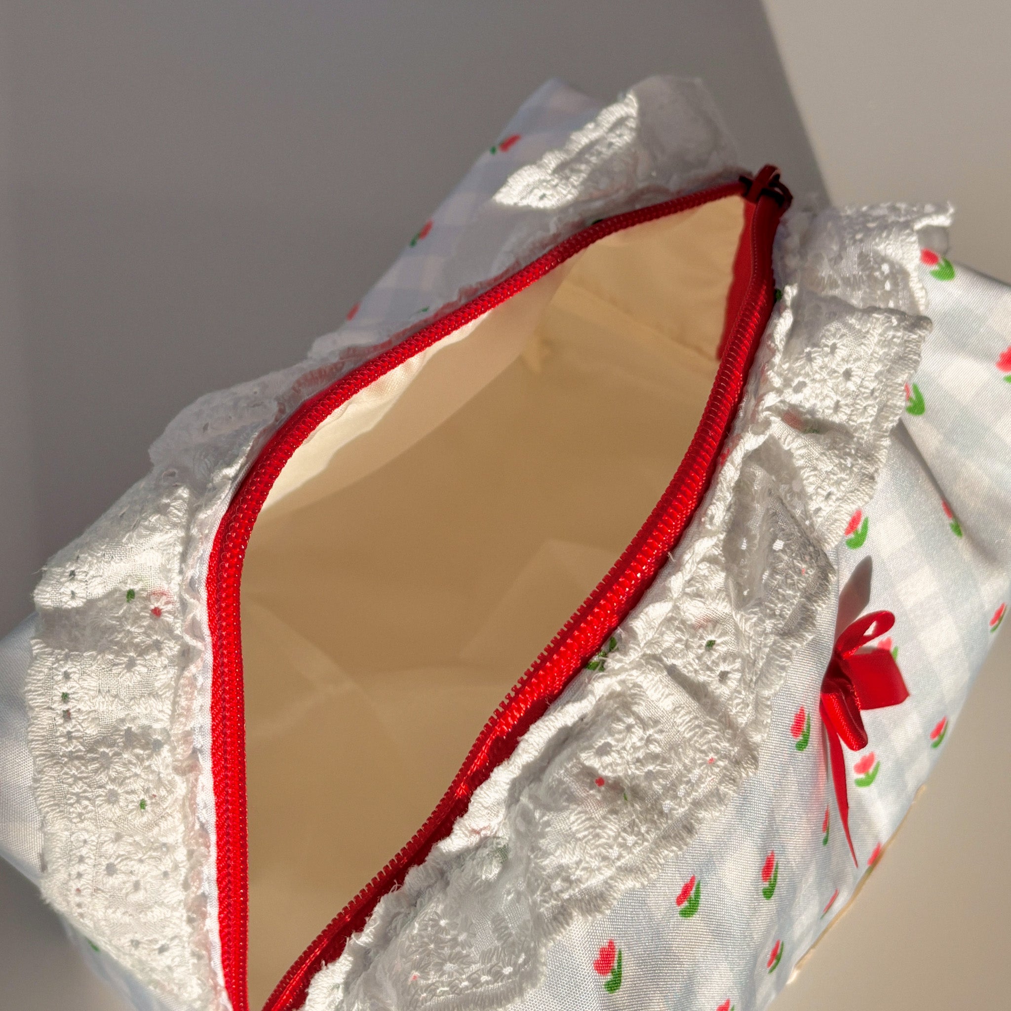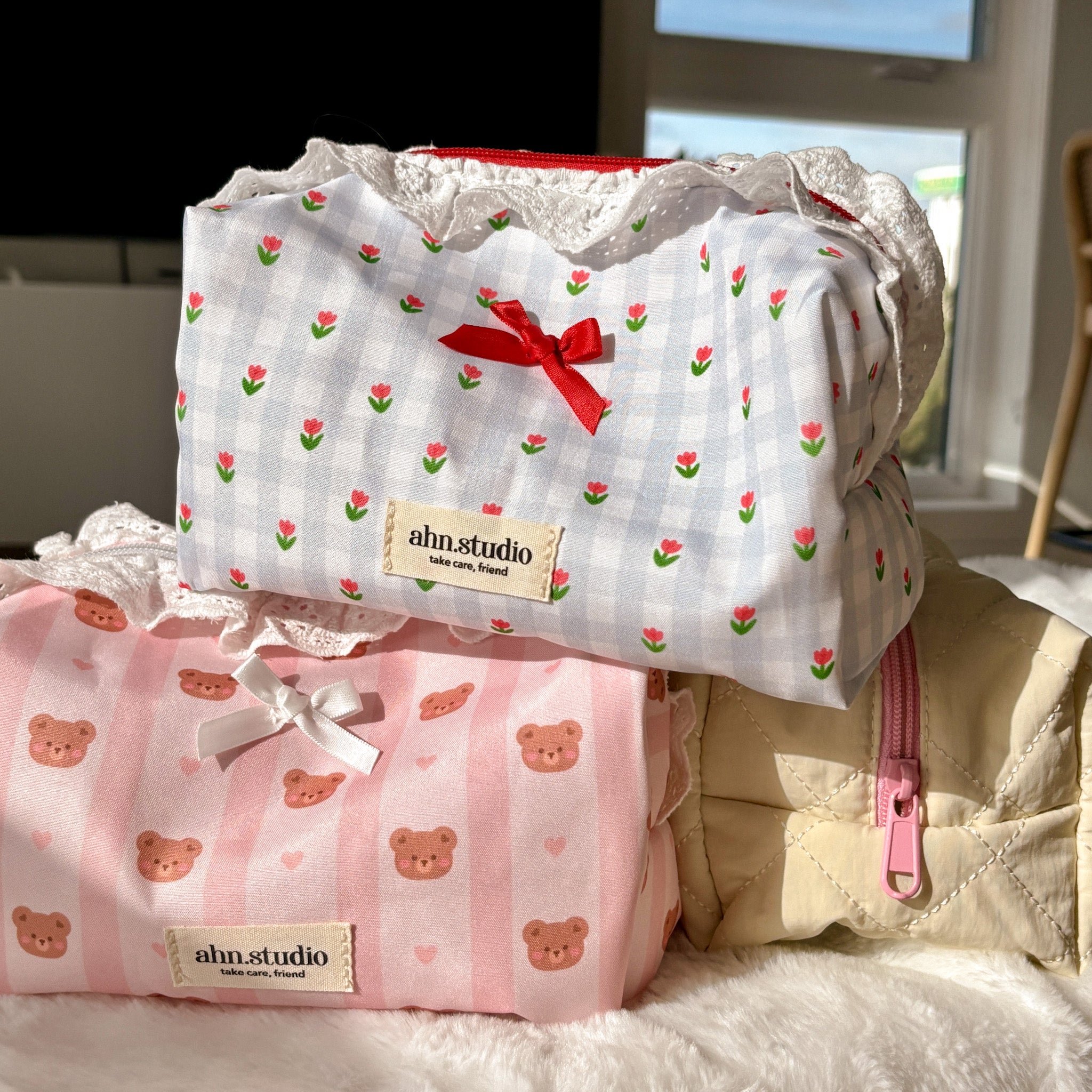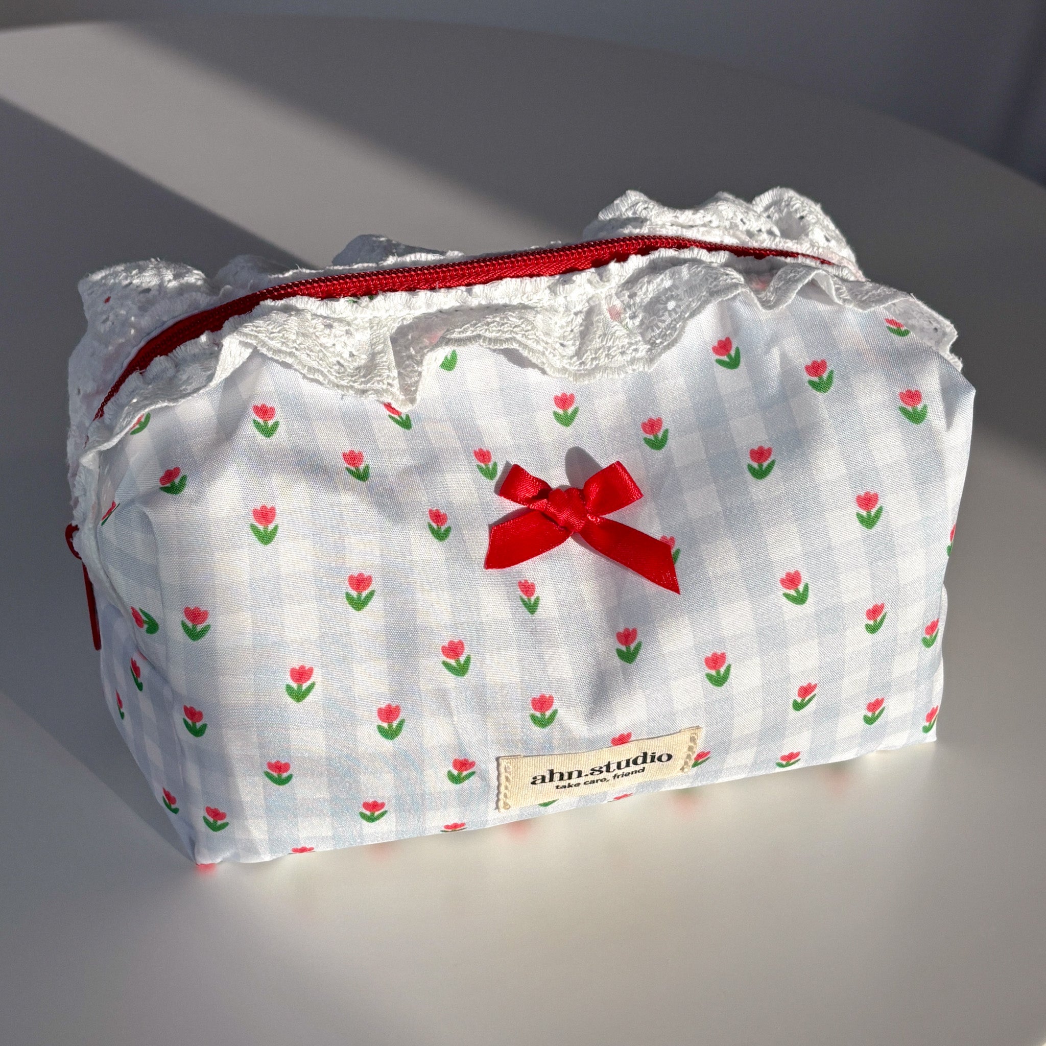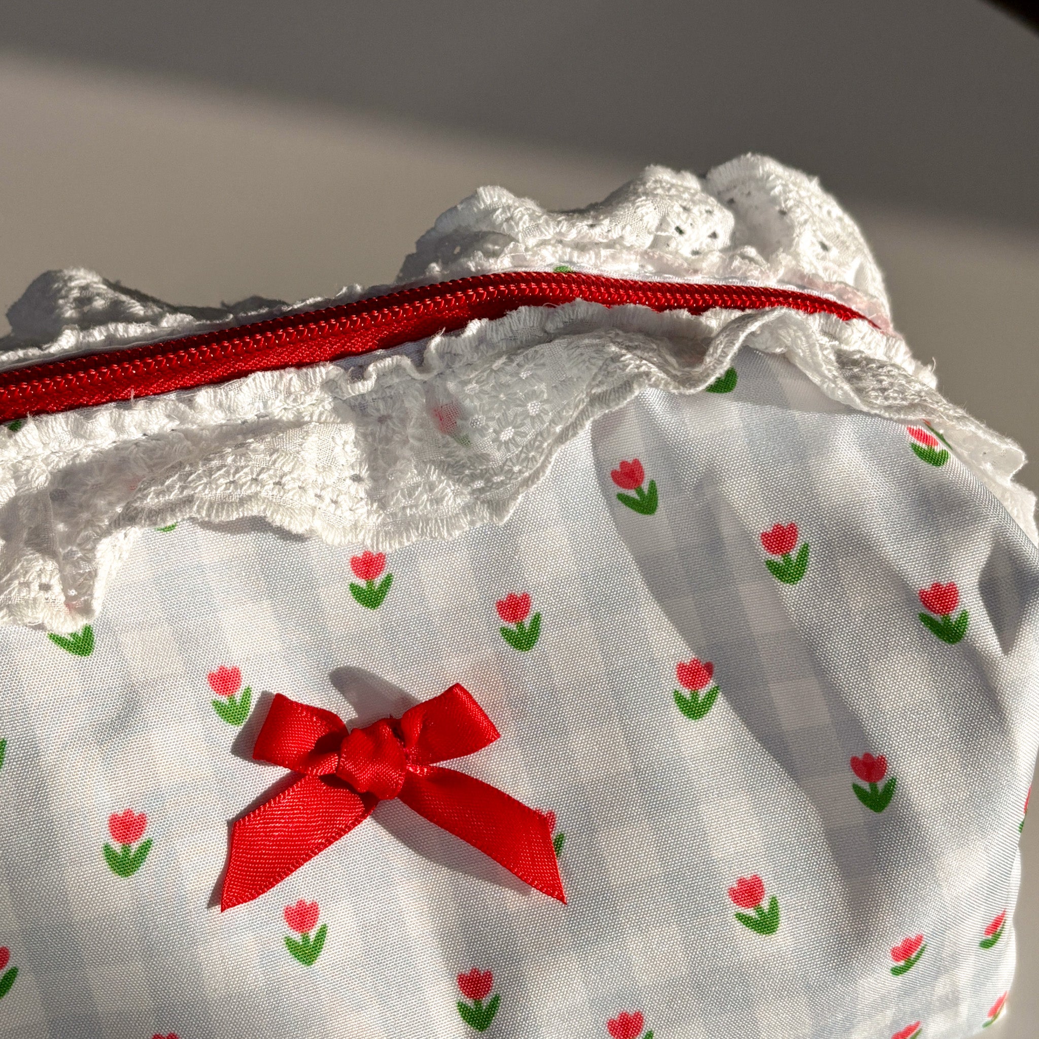 whether it's makeup, stationery, skincare, or more, take your daily essentials on-the-go in this cutesy pouch! featuring lace & bow details with our lovely tulip print and silky interior.