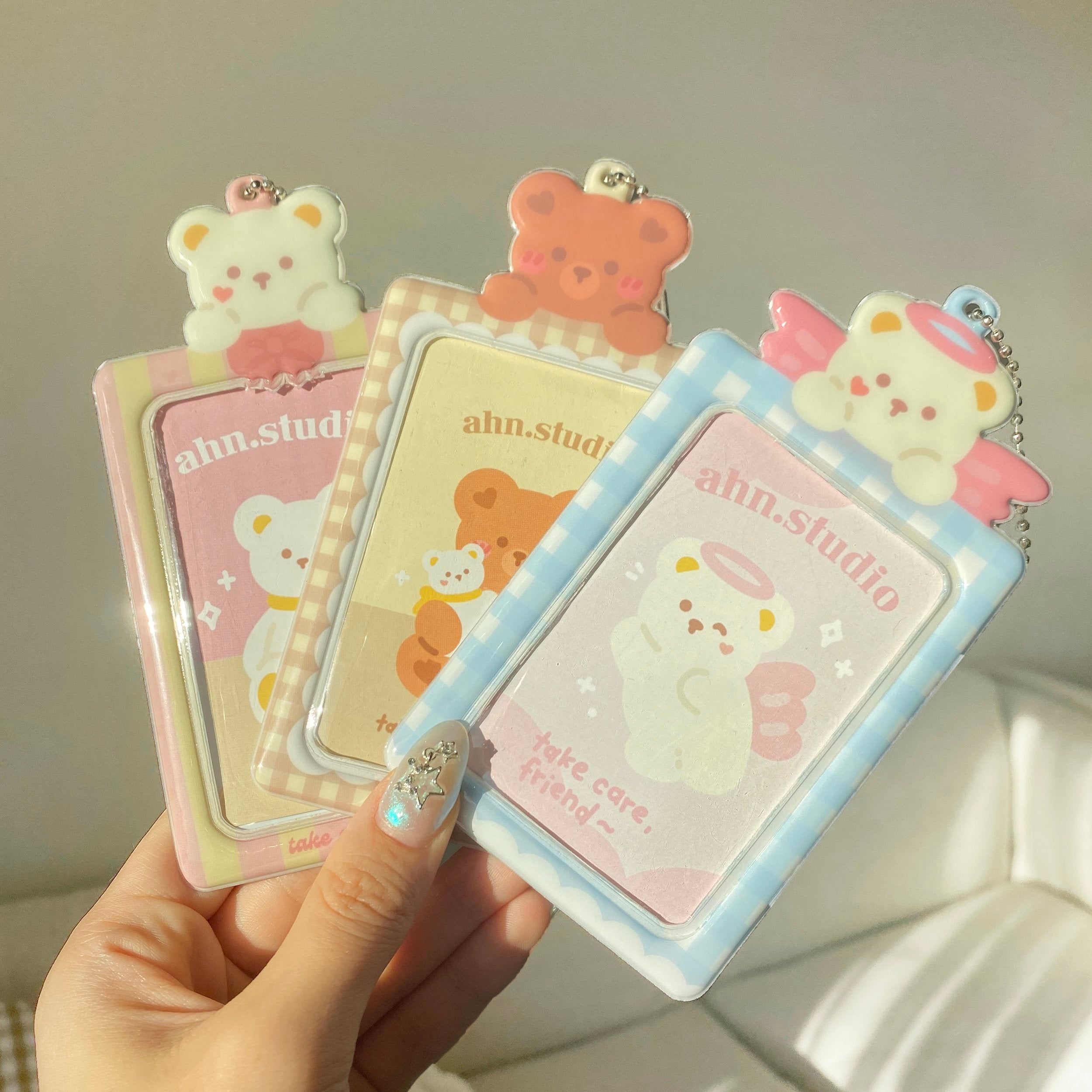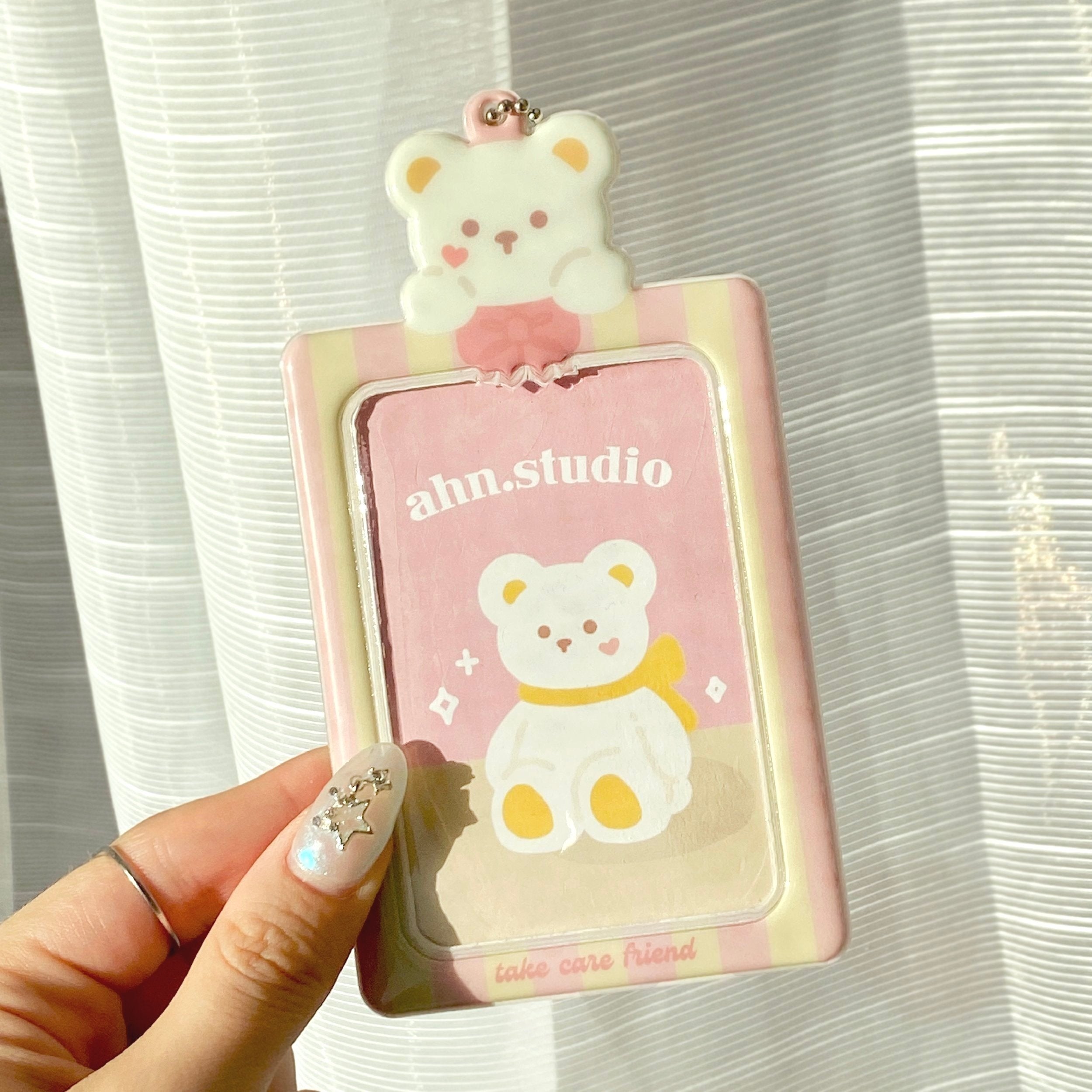 the cutest holder for your ID card, photo cards, and more! comes with one ball keychain attachment.